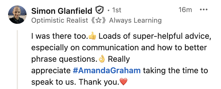“The information you provided from your experience was fantastic. You got the cogs turning when it comes to approaching new connections, and brought all kinds of ideas to the table. Thank you so much for doing it.”